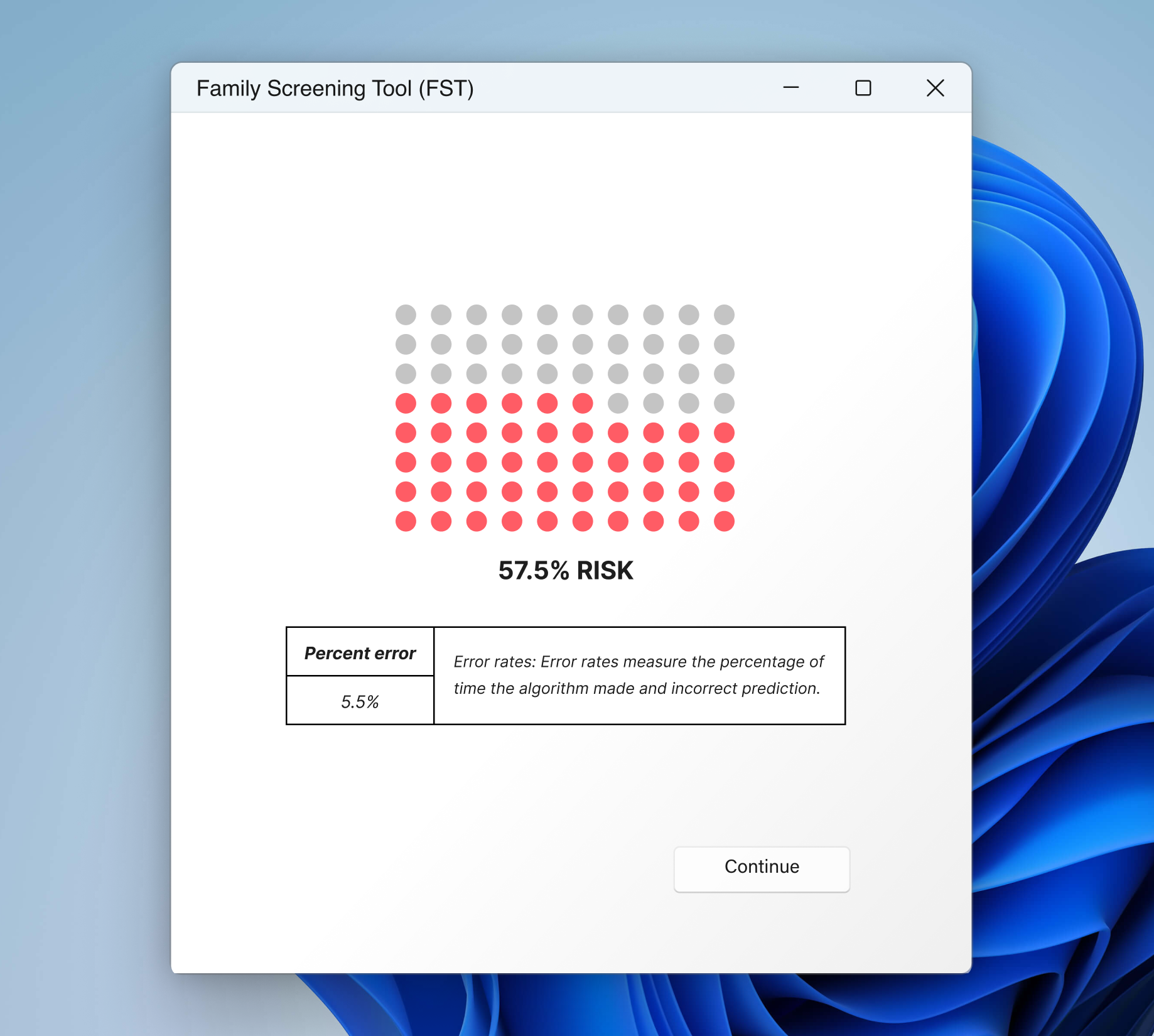 Using the Allegheny Family Screening Tool (AFST)—a system that helps child welfare workers assess family risk—I conducted a pilot between-subjects study with 225 participants to test whether graphical risk prediction widgets influence user decisions. Each participant reviewed a case scenario typical of AFST use and was randomly assigned one of four widget designs: two icon array variants (see Figure 1) and two gauge scale variants (see Figure 2). Participants then classified the case into low, medium, or high risk categories and completed a satisfaction survey about the system.